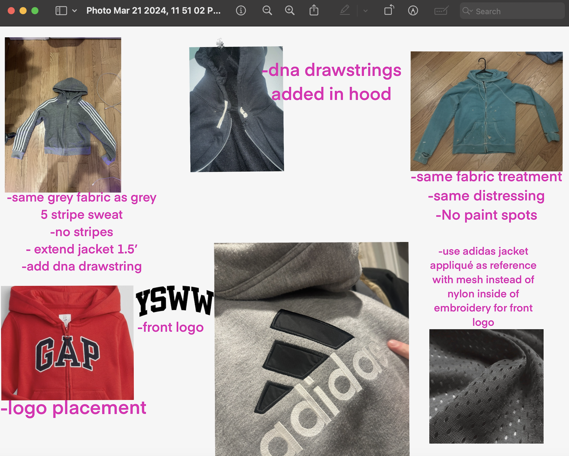 Most Currently this is a vague example of what my design process looks like. I typically find a reference piece I like whether it’s a thrift store item or whatever, test wear it for some time, find what I like and don’t like and go from there. I always have a strong vision of exactly what I want to make, while leaving room for open interpretation from outside perspectives. I’m most comfortable working with a team of technical designers that understand programs like Clove. Typically I am in studio with a few key members from the Yor design team, speaking openly about what i want to do and making sure they know what to make note of, we work together to perfect the cut and details until its exactly what I envision it to be. This is exactly what we send to the manufacturers to get as close to perfect results the first time around.